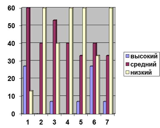 После проведения методики мы выявили: высокого уровня – 1 ребенок, среднего - 5 детей, низкого – 9 детей.